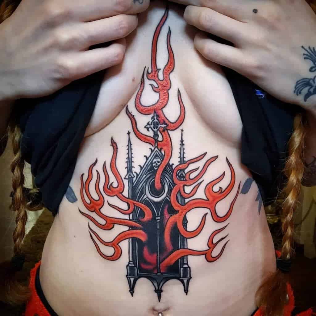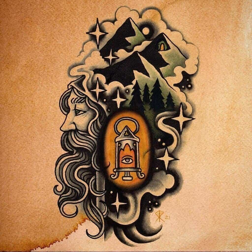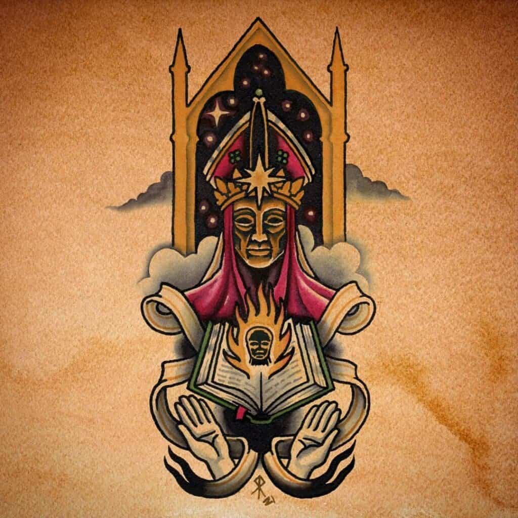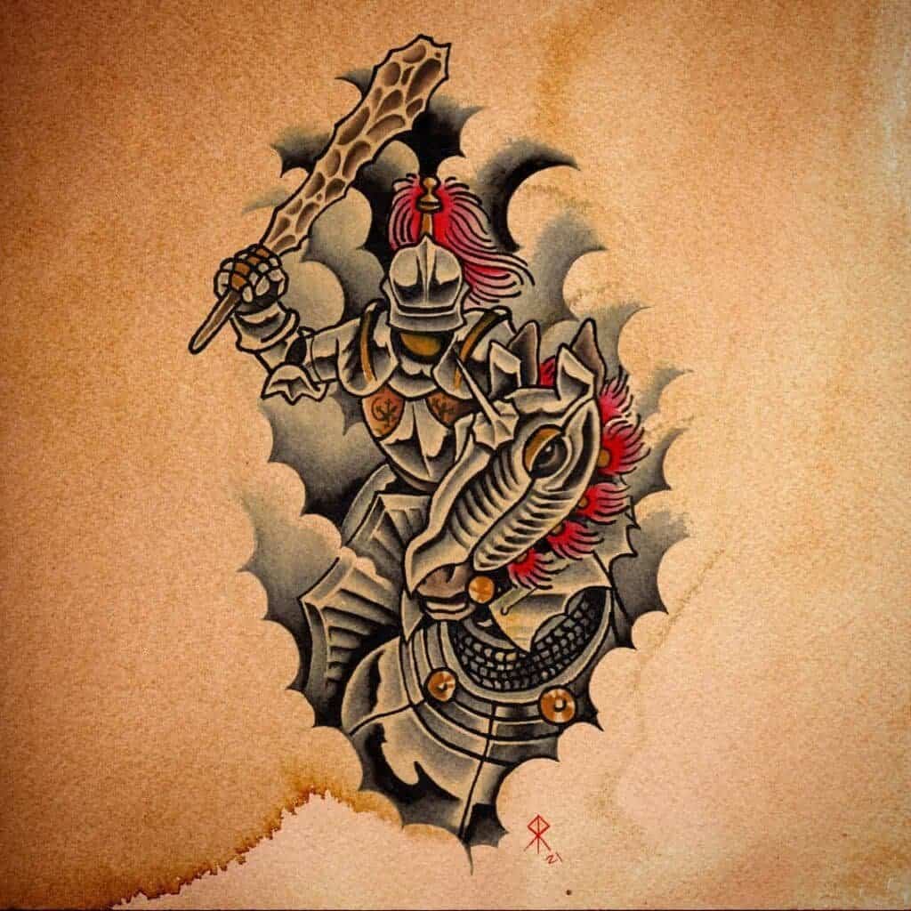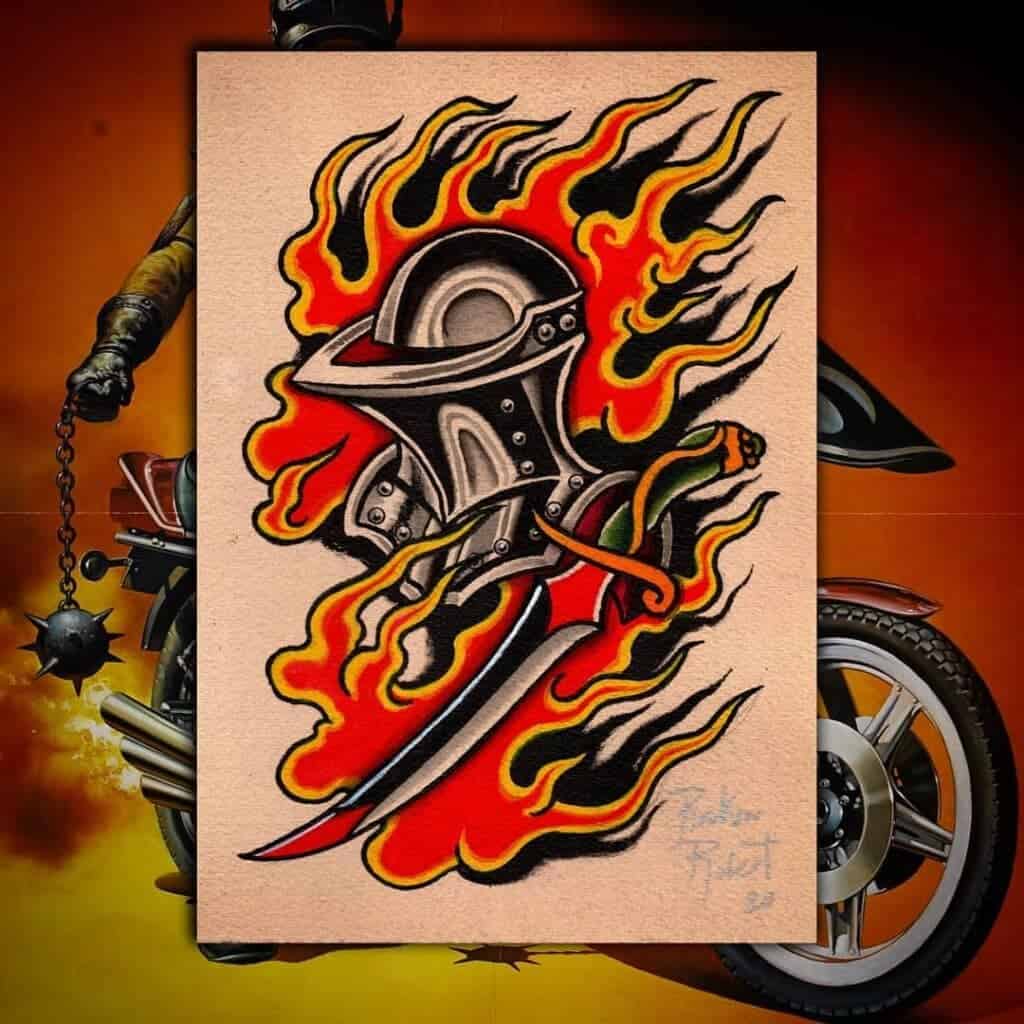 Rooted in traditional tattooing but unafraid to push into more intense and dramatic territory, his tattoos are defined by bold outlines, strong colour palettes, and scenes that often explore violence, power, and conflict.