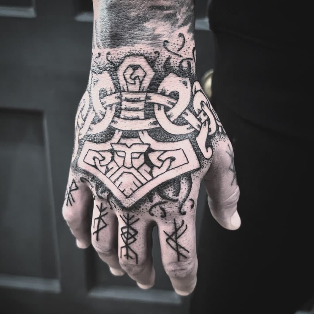 Thor’s hammer, Mjölnir, is a symbol of strength, protection, and resilience. In Viking culture, wearing or tattooing the hammer invoked divine safeguarding against evil and chaos.